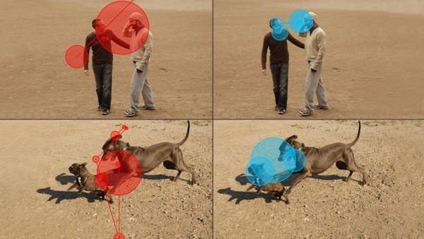 狗狗不仅善于读懂同胞的肢体语言,还十分擅长通过解读人类面部表情来感知其意图及情绪。与人一样,狗研究的是人右眼周围、往往最能体现人类情感的那部分区域。然而,狗和人类在社会阅读技巧方面究竟有哪些类似和区别?在一次创新实验中,科学家们让狗和受试人观察日常场景并记录其反应。研究者一共记录了46条狗和26个受试人分别在观察二人拥抱、二人互相走开、二狗打招呼和二狗互相把脸转开这四种场景下的眼球运动情况。经过训练,狗狗们在照片出现后趴下、面向监视器,和受试人一起观看相同的照片。与此同时,眼球追踪设备负责记录他们目光的焦点。结果显示,两者均对拥抱或互动的场景注视时间较长,而对互相走开或把脸转过去的场景注视时间较短。如图所示,红圈和篮圈分别显示了狗和受试人的注意力焦点,圈越大则表明注视时间越长;直线表示视线转移路径。狗狗如同小婴儿般对社交性场景比非社交性场景更为关注的事实表明,它们能够很快识别出那些人类互动的场面,也对此更加感兴趣。然而,比较两幅图片中的大红圈可以看出,狗狗凝视人类拥抱画面所用的时间远远超出它们看同类打招呼的时间。它们的目光在拥抱者之间游移,说明需要更多时间来解读图中人物动作的含义。同样的,与看同类拥抱相比,受试人会花费更多时间去关注狗狗之间打招呼,视线在狗狗之间转移也更为频繁。今日在线发表在《皇家学会开放科学》(Royal Society Open Science)中的这一研究称,注视时间和眼球运动的差异表明,即便表情破解专家在解读异类的神秘表情时也往往需要付出更多努力。