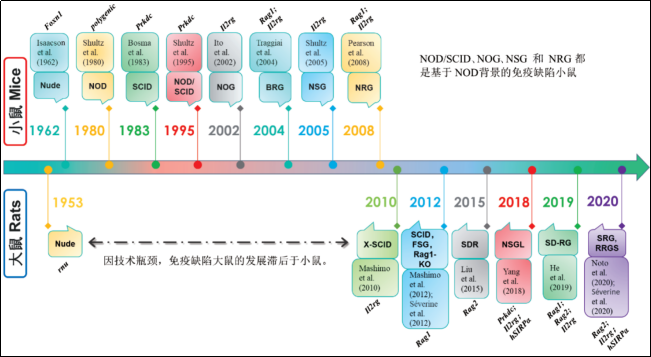 图1 免疫缺陷小鼠和大鼠模型的发展历程[1]