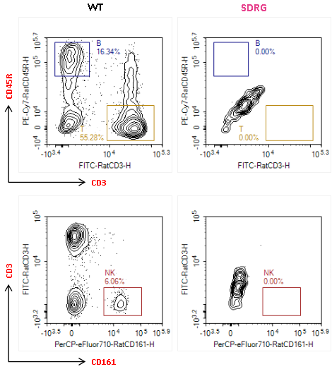 通过流式细胞术检测野生型大鼠和SDRG大鼠外周血中免疫细胞的组成。检测结果显示,与野生型大鼠相比,SDRG大鼠外周血中的T细胞、B细胞和NK细胞完全缺失。