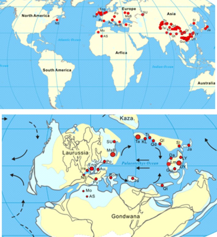 石炭纪是著名的巨型生物时代,除了大家熟知的巨型蜻蜓、巨型蜘蛛等陆生生物,海洋中同样生活着一些体型巨大的无脊椎动物,如菊石、腕足动物等。不少研究已经表明陆地生物的大型化主要是与大气中较高的氧含量有关(石炭纪高达约35%),然而,海洋中无脊椎动物大型化影响因素目前仍无明确结论。 大长身贝(Gigantoproductus)是体型最大的腕足动物之一,为早石炭世地层中的一类标准化石,在野外通常聚集成层,壳体宽达10厘米以上。而地史时期绝大多数腕足动物体型不超过2-3厘米。为深入了解这类大型腕足动物的分布和演化规律,中国科学院南京地质古生物研究所乔丽博士等在华南多次野外工作中采集了一定数量的相关标本,同时结合已经记录的大长身贝化石产地和地理分布研究分析了它们的分布和演化规律。 研究发现大长身贝的空间和时间分布具有很明显的局限性。时间上它们主要出现在早石炭世中晚期(维宪期中期——谢尔普霍夫中晚期)。空间上主要分布在欧亚地区。通过古地理重建发现,大长身贝主要是围绕中、低纬度的古特提斯洋分布(图2),因此适应赤道地区相对狭窄的区域气候和环境。因此,当早石炭世晚期全球晚古生代大冰期大规模发展,大长身贝就迅速消失了。目前有关大长身贝体型大小的影响因素仍需更多研究。 相关研究成果于近期发表在国际学术刊物《三古》(Palaeogeography, Palaeoclimatology, Palaeoecology)。该项研究得到了国家自然科学基金的支持。