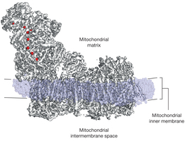 Abstract: Complex I (NADH:ubiquinone oxidoreductase) is essential for oxidative phosphorylation in mammalian mitochondria. It couples electron transfer from NADH to ubiquinone with proton translocation across the energy-transducing inner membrane, providing electrons for respiration and driving ATP synthesis. Mammalian complex I contains 44 different nuclear- and mitochondrial-encoded subunits, with a combined mass of 1 MDa. The 14 conserved ‘core’ subunits have been structurally defined in the minimal, bacterial complex, but the structures and arrangement of the 30 ‘supernumerary’ subunits are unknown. Here we describe a 5 Å resolution structure of complex I from Bos taurus heart mitochondria, a close relative of the human enzyme, determined by single-particle electron cryo-microscopy. We present the structures of the mammalian core subunits that contain eight iron–sulphur clusters and 60 transmembrane helices, identify 18 supernumerary transmembrane helices, and assign and model 14 supernumerary subunits. Thus, we considerably advance knowledge of the structure of mammalian complex I and the architecture of its supernumerary ensemble around the core domains. Our structure provides insights into the roles of the supernumerary subunits in regulation, assembly and homeostasis, and a basis for understanding the effects of mutations that cause a diverse range of human diseases.