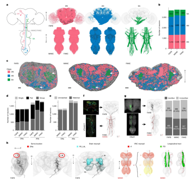 在这项研究中,研究人员利用电子显微镜(EM)技术整合了三个独立的数据集,并首次绘制出了果蝇整个神经系统的详细地图。这些数据集包括雌性果蝇的大脑和腹神经索以及雄性果蝇的腹神经索;研究人员不仅成功重建了所有通过颈部连接的神经元,还首次将这些神经元与光镜水平的数据进行匹配,揭示了这些神经元在大脑和腹神经索中的具体位置和功能。