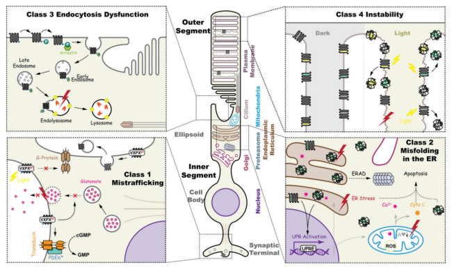 图2. 视紫红质(Rhodopsin)蛋白的功能及不同突变类型对其功能的影响 [2]。