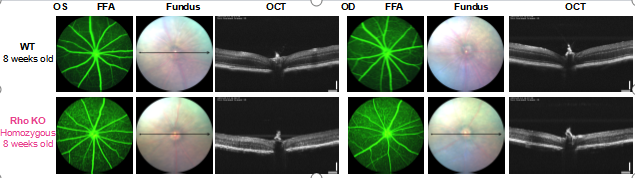 图4. 8周龄纯合Rho KO小鼠和野生型小鼠(WT)眼底形态(Fundus)、光学相干断层扫描(OCT)和荧光素眼底血管造影(FFA)检测结果。