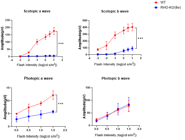 视网膜电图(ERG)检测显示,该模型小鼠在暗适应和明适应条件下的a波、b波波幅均显著低于野生型对照,提示感光细胞功能受损,电生理活性下降。