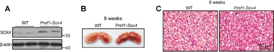 (A)WT组小鼠和Pref1-Sox4组小鼠(8周,雄鼠)BAT SVF中SOX4的表达量。(B-C)8周龄雄性的WT鼠和Pref1-Sox4鼠棕色脂肪组织的解剖图(B),图C为两组小鼠棕色脂肪对应的H&E染色图,标尺为60 μm。