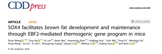 Wang S, He T, Lu Y, et al. SOX4 facilitates brown fat development and maintenance through EBF2-mediated thermogenic gene program in mice [J]. Cell Death Differ 2024: https://doi.org/10.1038/s41418-024-01397-0.