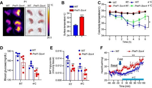 为探究SOX4对棕色脂肪产热功能的影响,研究人员比较了WT组与Pref1-Sox4组小鼠的体温和代谢指标。如图3A-B,出生后1天的Pref1-Sox4组小鼠表面温度(32 ℃)显著高于WT组(28.2 ℃)。在8周龄时,常温下两组小鼠体温无明显差异;但急剧冷刺激下,Pref1-Sox4组在第4小时体温降至最低,随后回升至37 ℃,而WT组降至35.5 ℃(图3C)。冷刺激后,Pref1-Sox4组血糖较低,且其棕色脂肪的TG含量在常温及冷刺激条件下均低于WT组 (图3D-E)。此外,在冷刺激下,Pref1-Sox4组的产热显著高于对照组(图3F)。这些结果表明,SOX4的过表达增强了棕色脂肪的产热功能及冷刺激下的代谢水平。