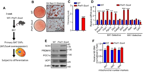 (A-C)从WT小鼠和Pref1-Sox4过表达小鼠(雄鼠,3周龄)的棕色脂肪组织中分离BAT SVF细胞直接进行体外诱导实验,实验设计方案如图A所示。在诱导后的第7天,进行油红染色实验(B)和TG含量测定实验(C),标尺长度为100 μm。(D) 在诱导后的第7天,RT-PCR检测Ucp1、Pgc1α、Prdm16和Dio2等产热基因的mRNA水平以及白色选择性基因的mRNA水平。(E)两组细胞产热相关蛋白的表达水平。(F)提取两组细胞的DNA,RT-PCR检测线粒体数量相关基因(Nd1、Nd2和Nd4)的表达。